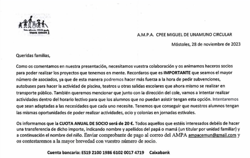 Sólo podrán ser socios de derecho aquellas madres y padres de los alumnos del Colegio Miguel de Unamuno, abonando una única cuota anual de 20€ al año. Os dejamos la información detallada a continuación: